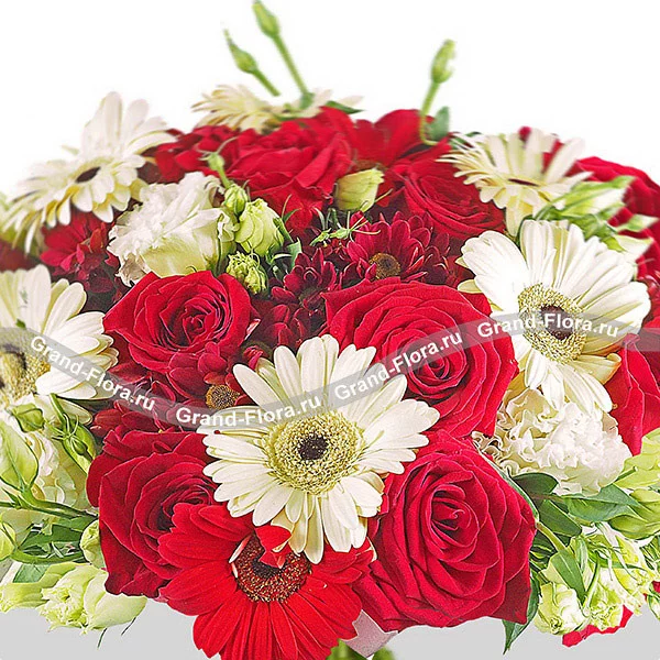 Стандартный (на фото): роза красная - 11 шт, гербера белая - 6 шт, хризантема кустовая красная - 5 шт, эустома белая - 5 шт, сетка красная.